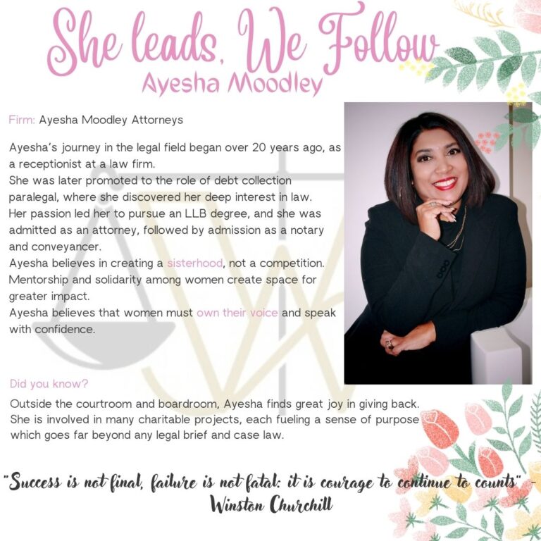 Firm: Ayesha Moodley Attorneys Ayesha’s journey in the legal field began over 20 years ago, as a receptionist at a law firm. She was later…